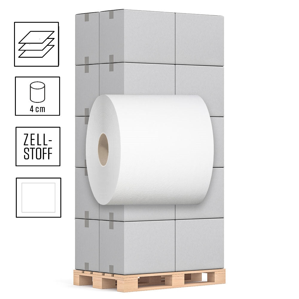 1 Palette Handtuchrollen, 3-lagig, Zellstoff hochweiß, Außenabrollung, 4er Hülse, 20cm Breite, mit 100m pro Rolle, Pal.= 40 VE