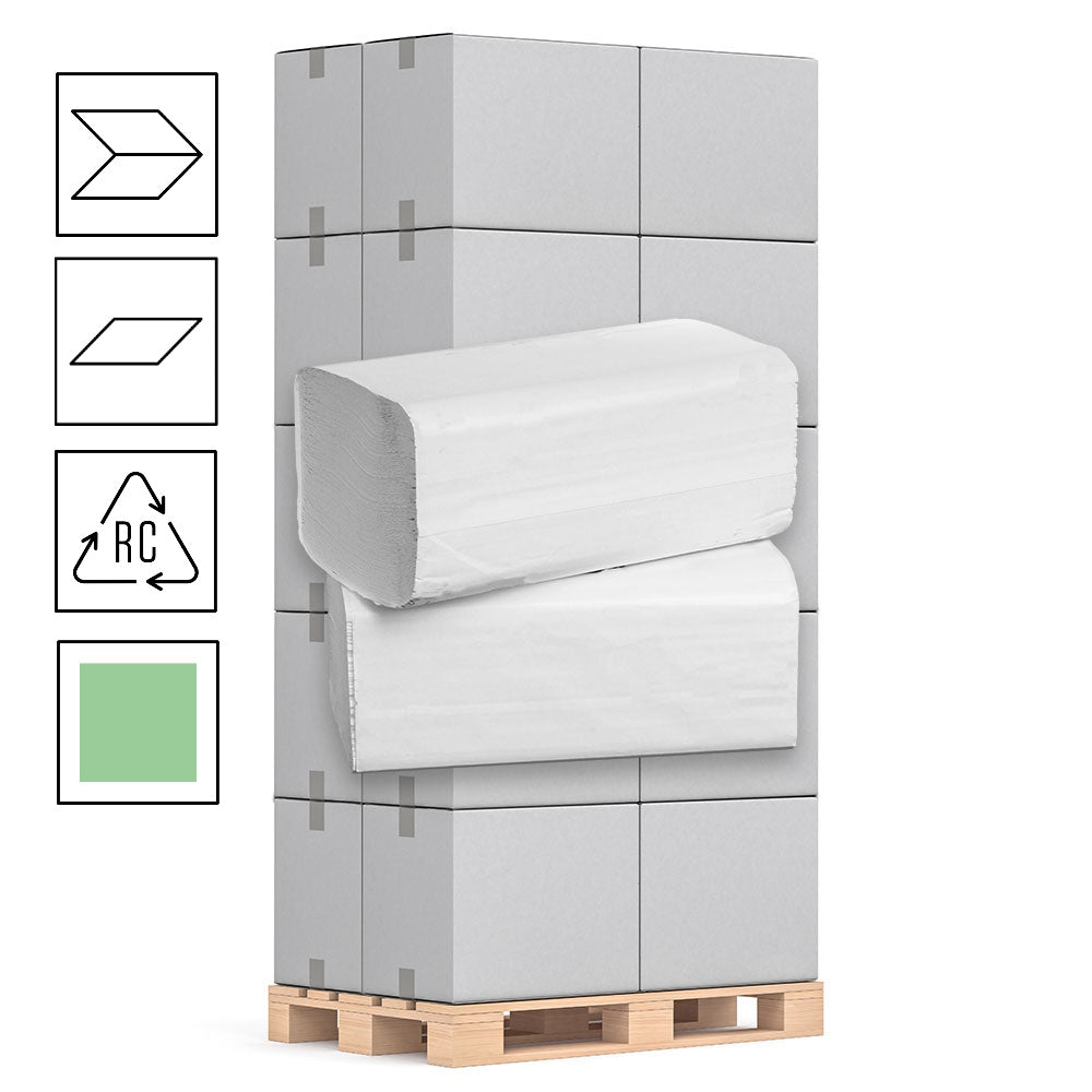 1 Palette Falthandtücher 1-lagig, Recycling grün, 25cm x 23cm V/ZZ-Falz, 4000 Blatt, Pal.= 32 VE