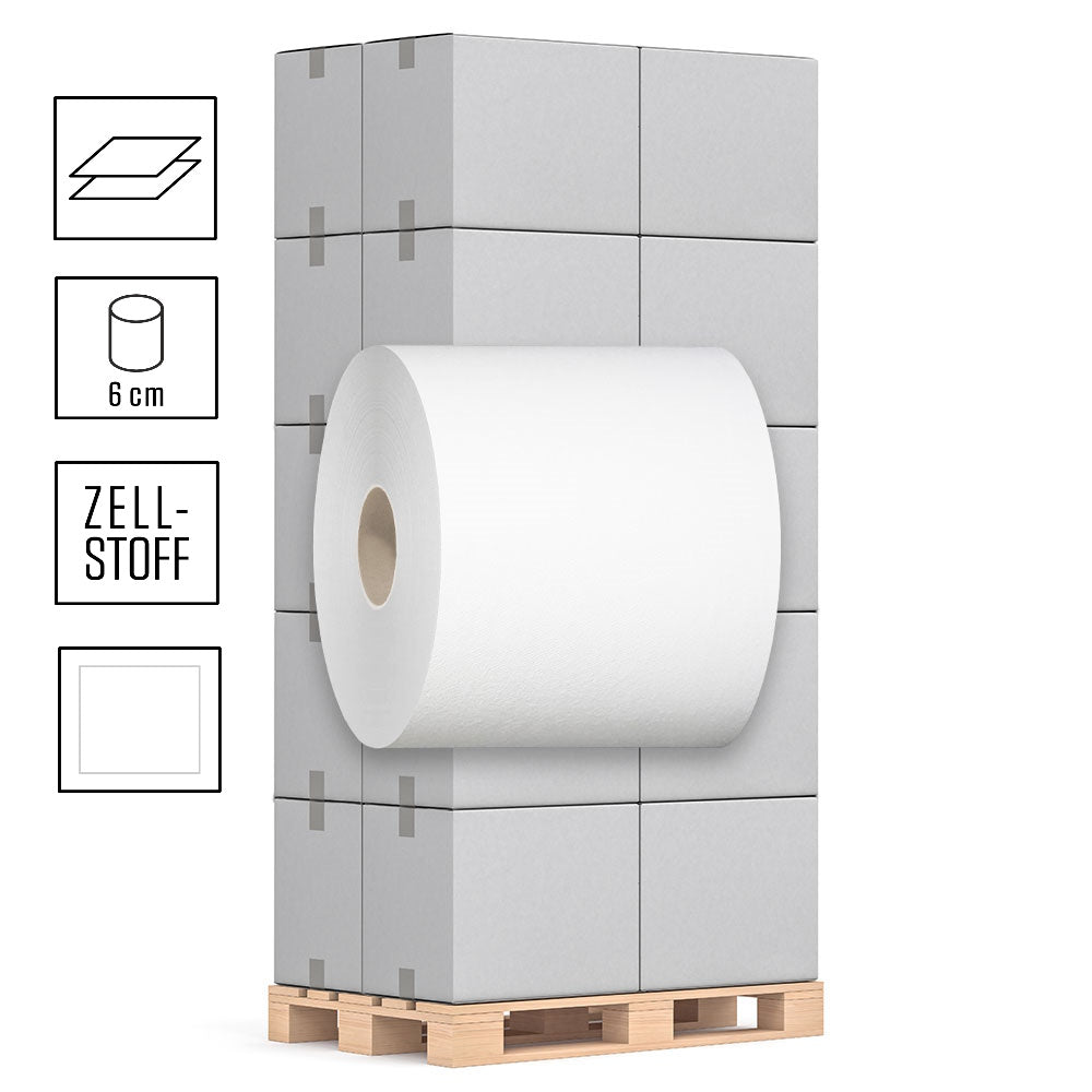 1 Palette Handtuchrollen, 2-lagig, Zellstoff hochweiß, Innenabrollung, ca. 310 Blatt pro Rolle, Pal.= 55 VE